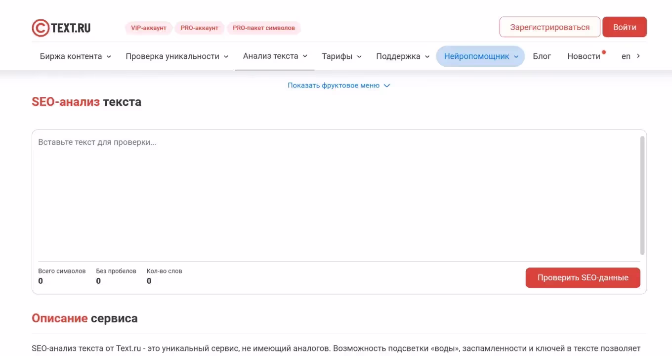 Этот сервис способен проверять уникальность текста и указывать количество орфографических и пунктуационных ошибок, а также предоставлять результаты SEO-анализа, включая процент «воды». Для незарегистрированных пользователей ограничение на проверку — 15 тысяч символов в день. После регистрации и подтверждения номера телефона лимит увеличится до 50 тысяч символов.