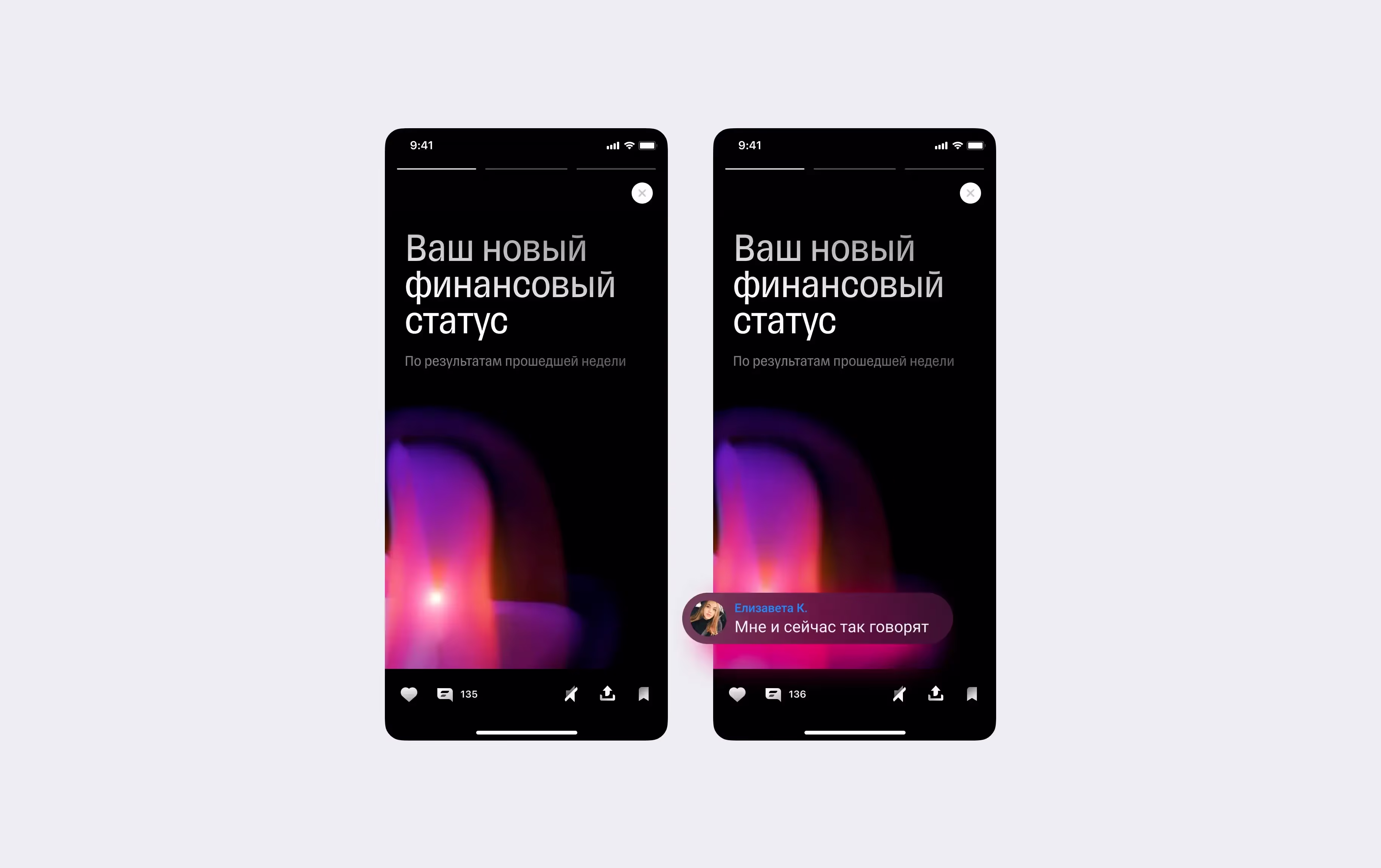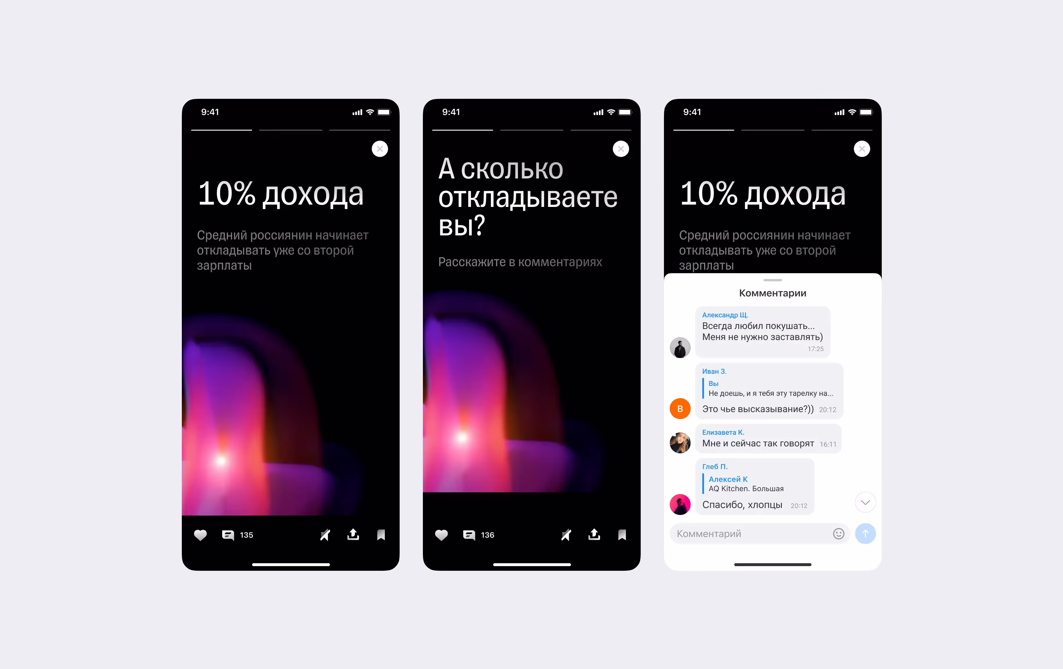 Интегрироваться с Т—Ж и выводить их комменты в ленте мобильного банка было сложно. В историях добавить модуль комментов было сильно проще, поэтому начали с них. Если комменты в историях покажут рост метрик, то следующим шагом будет тест комментов в ленте, каналах, отзывах, ачивках и других продуктах нефинансовых сервисов.