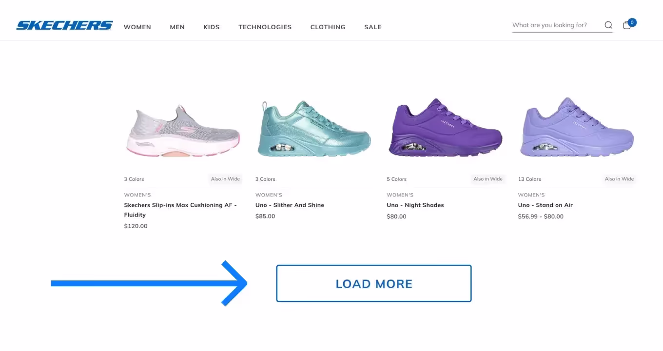 Для загрузки новых товаров в категориях рекомендуется использовать кнопку «Загрузить еще» в сочетании с бесконечным скроллингом.