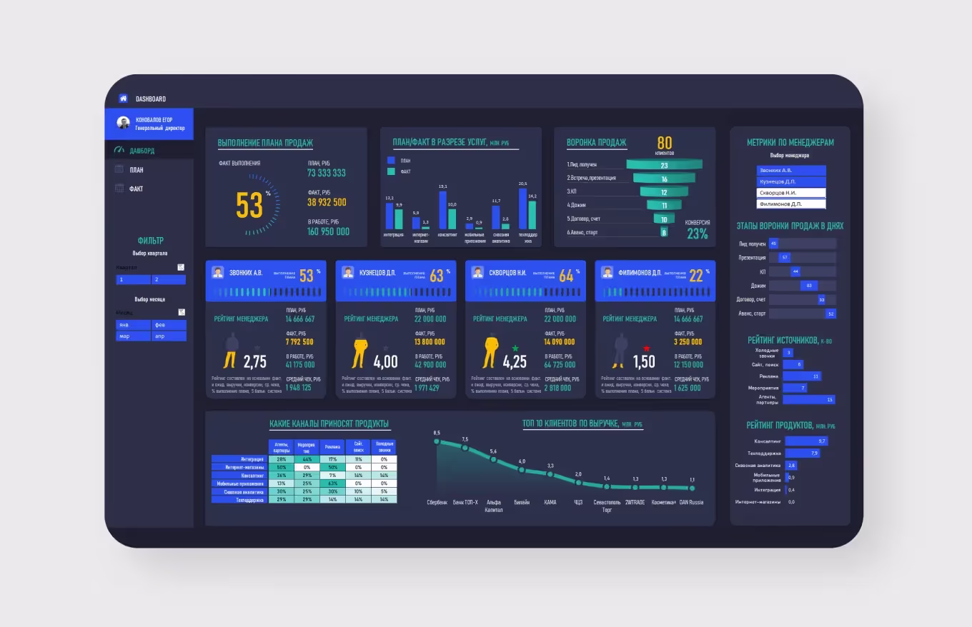 Дашборды также могут быть ориентированы на конкретную группу пользователей. Например, для руководителей компании может быть создан управленческий дашборд, который отображает информацию о финансовых показателях, производственных процессах. Для отдела продаж — продажный дашборд, который содержит информацию о продажах, количестве лидов, уровне удовлетворенности клиентов.