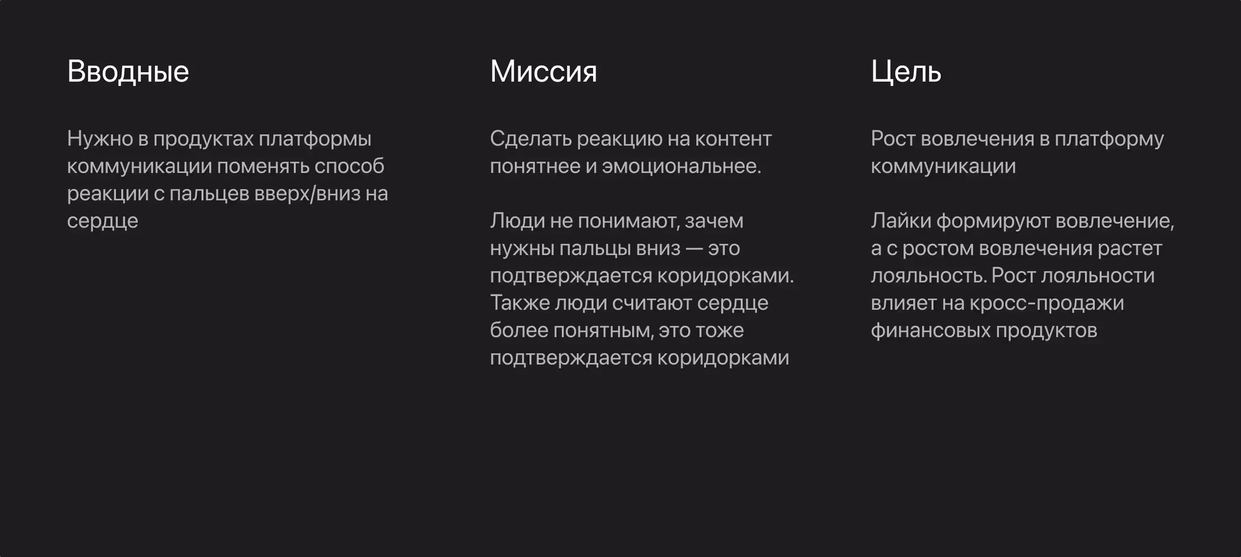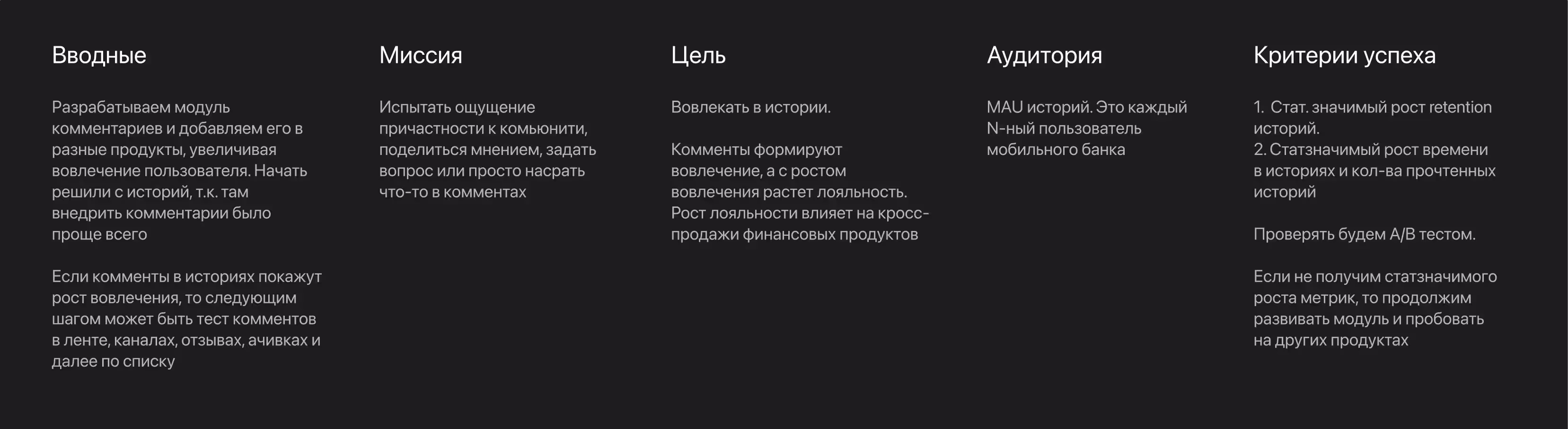 Некоторые члены команды могут приносить гипотезы или уже описанные решения. Важно помнить, что составление гипотез — это часть этапа видения и исследования, и к пониманию задачи они не относятся. Поэтому разбираем все гипотезы на вводные, миссию, цель, аудиторию и критерии успеха.