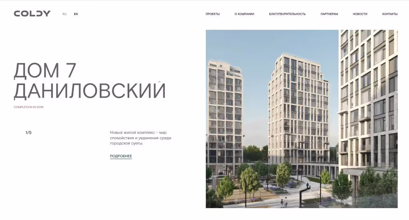 В этом примере представлено несколько проектов компании в виде карусели. У каждого проекта есть кнопка для более детального изучения.