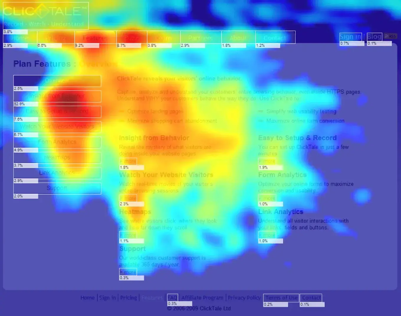Эта карта показывает время, которое пользователь потратил на просмотр страницы, и как далеко человек ее прокрутил. Сервисы: Яндекс Метрика, Crazy Egg и Decibel Insight.