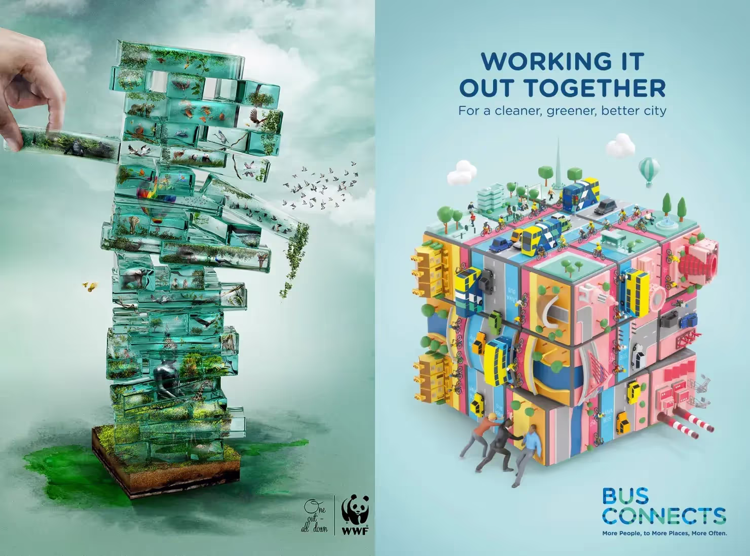 BusConnects — это проект, созданный Национальным транспортным управлением Дублина (Ирландия). Он заключается в пересмотре автобусных маршрутов, чтобы пересадить людей из машин в общественный транспорт и сократить выброс CO2. Метафора в виде «кубика Рубика» символизирует город и подчеркивает важность стратегии, а также коллективных усилий жителей в создании более чистого и зеленого Дублина.