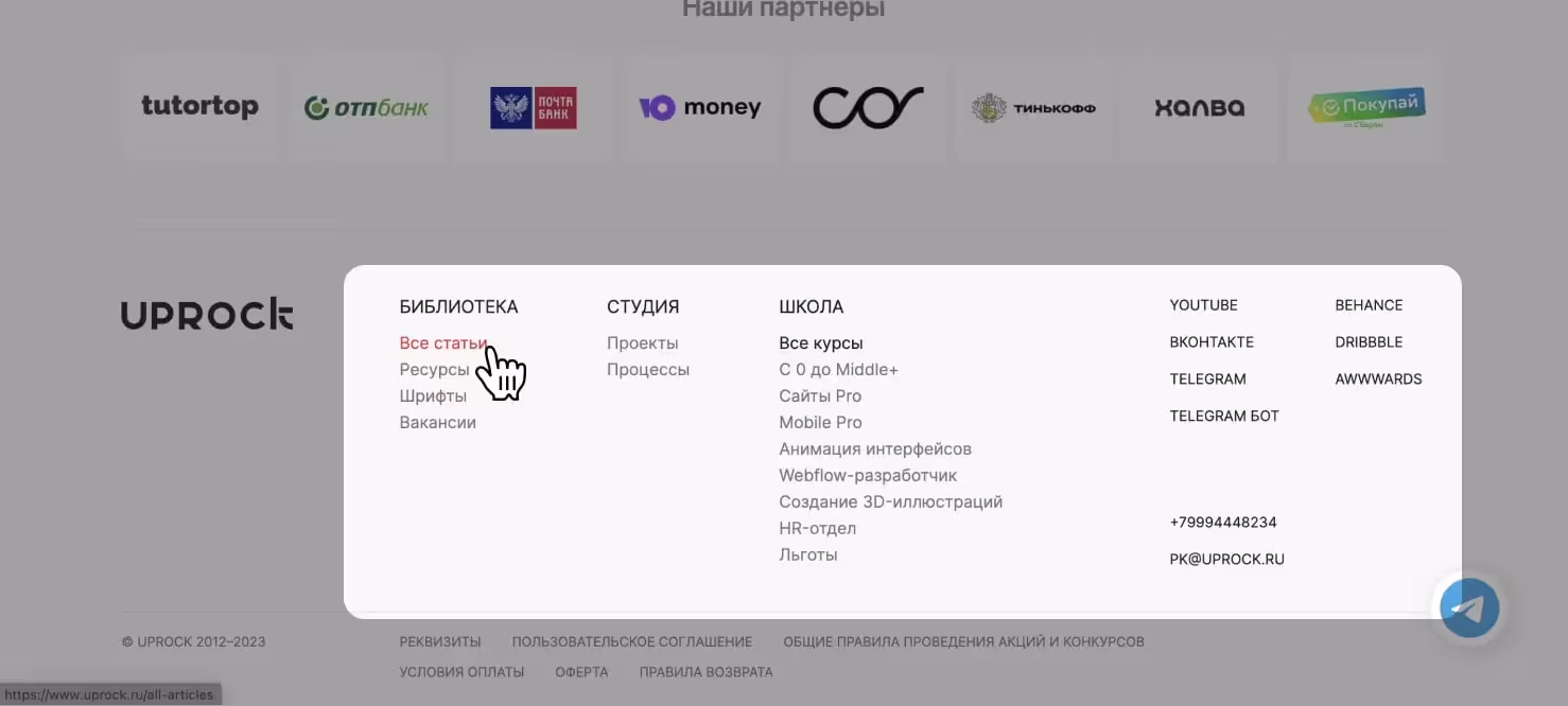 Один из обязательных навигационных элементов, где размещаются ссылки на все разделы сайта и важная информация о компании: контактные сведения, адрес, реквизиты, ссылка на соцсети, форма обратной связи и все, что не уместилось в главное меню.