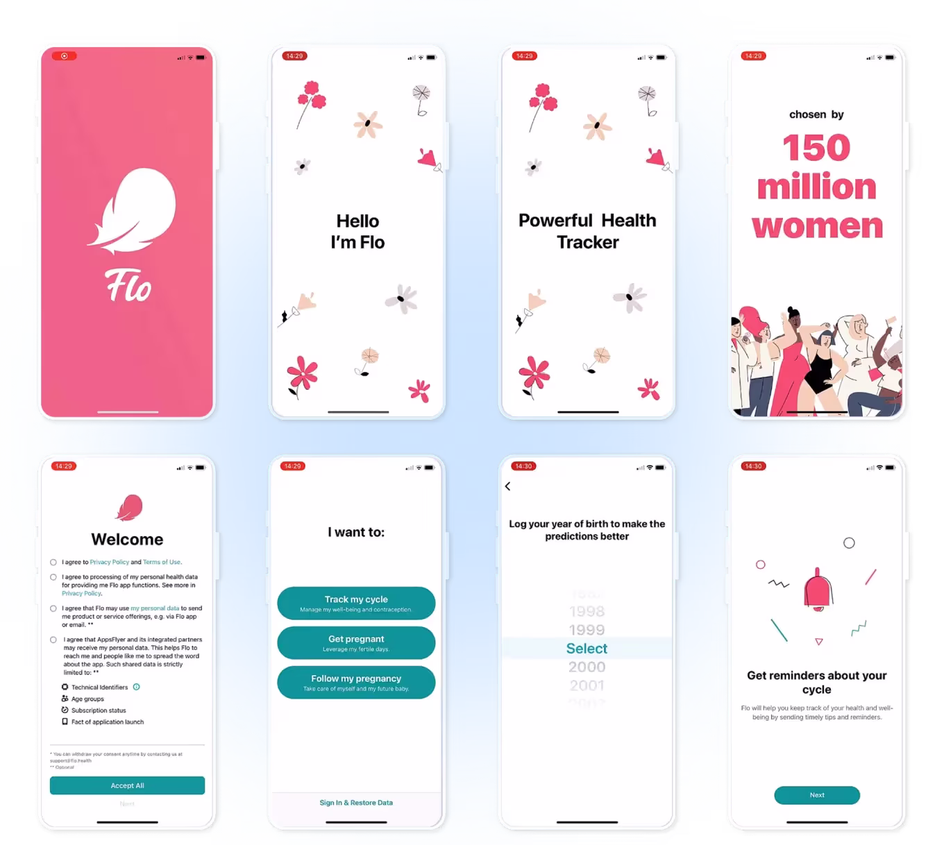 Flo — приложение, которое поддерживает женщин на каждом этапе их репродуктивного цикла. Длинный онбординг Flo демонстрирует социальное доказательство (количество пользователей), выбор цели (следить за циклом, планировать беременность), ввод данных в виде теста, необходимых для дальнейшего пользовательского опыта. Долгий онбординг в данном продукте оправдан спецификой и направлен на улучшение дальнейшего взаимодействия.