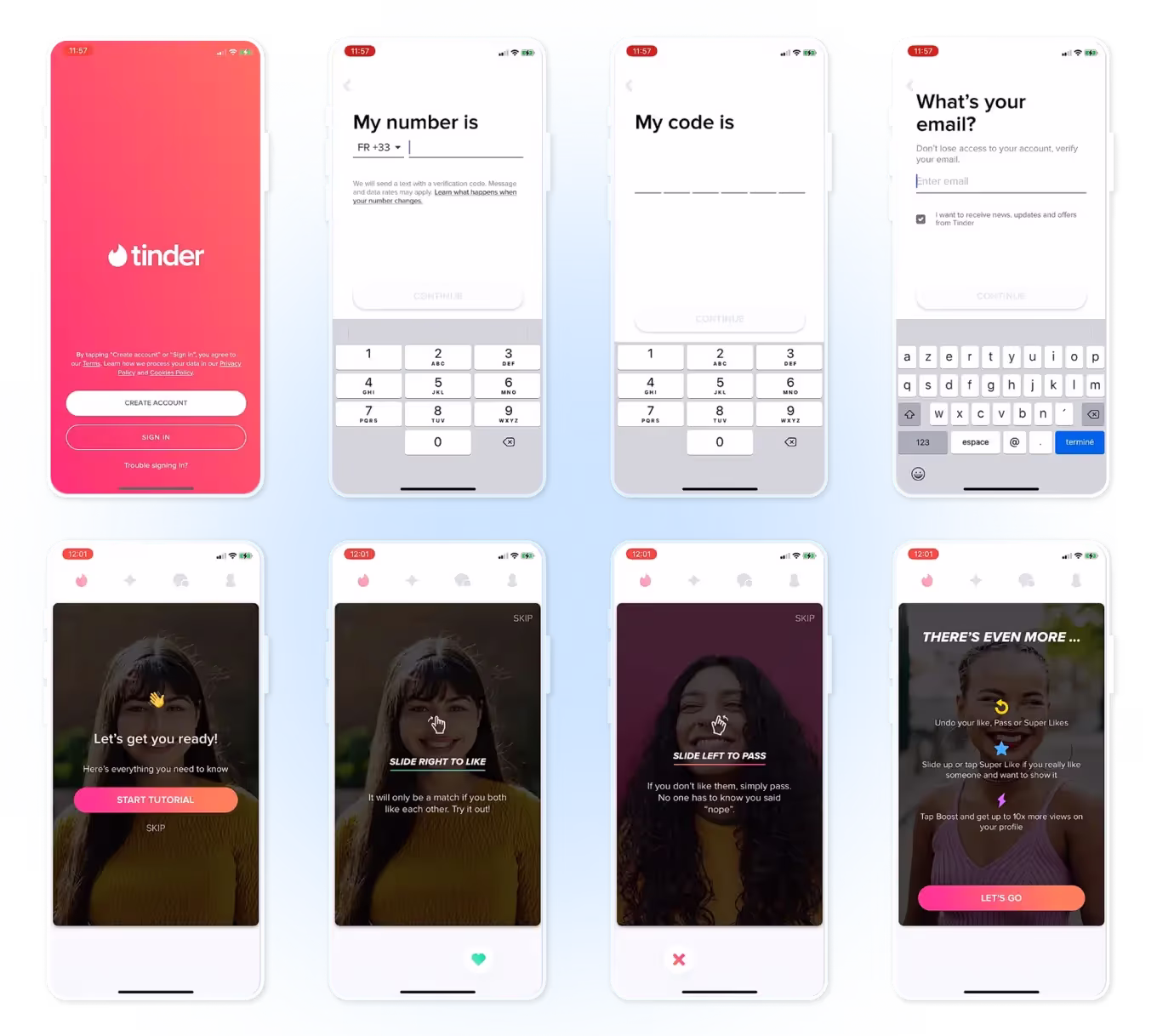 Приложение, предназначенное для романтических знакомств в соответствии с заданными параметрами и с учетом геолокации. Онбординг начинается с ввода данных, необходимых для использования (имя, возраст, локация, предпочтения). Простой и интуитивно-понятный пользовательский интерфейс не требует долгого обучения, описание основных функций органично включено в первый опыт пользования.