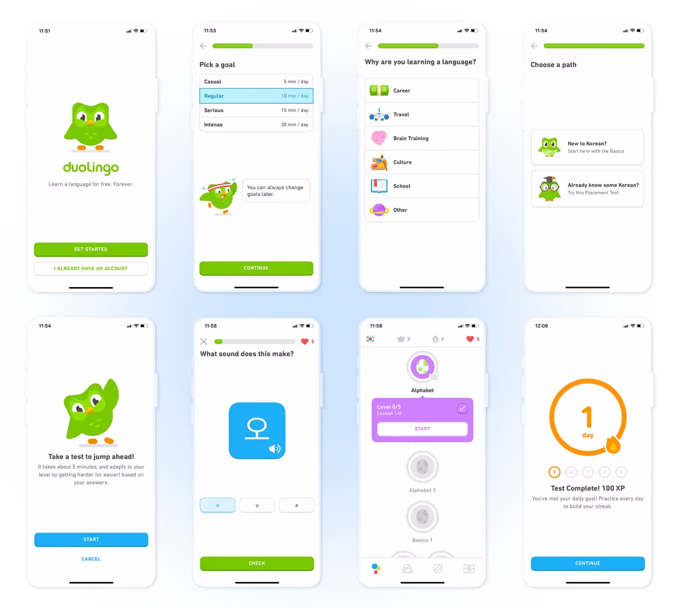 Платформа для изучения иностранных языков. Объяснение ключевых функций вплетено в первые уроки: пользователь сразу же начинает взаимодействие и одновременно обучается. В начале предлагается выбрать цель — изучение языка для карьеры, обучения, путешествий и выбрать уровень студента. Визуал соответствует общей дизайн-концепции интерфейса, характеризуется простотой и краткостью.