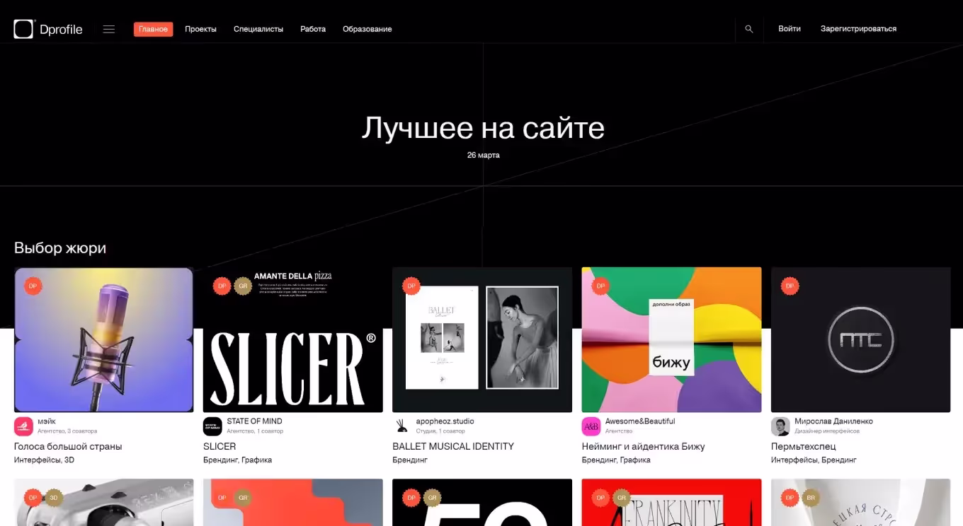 Dprofile — выбор дизайнеров, которым важно комьюнити и постоянное развитие. Вокруг площадки огромное количество чатов, различных онлайн или офлайн-лекций. К тому же награды там получить проще, чем на Behance. Проекты предпочтительнее выкладывать на кириллице.