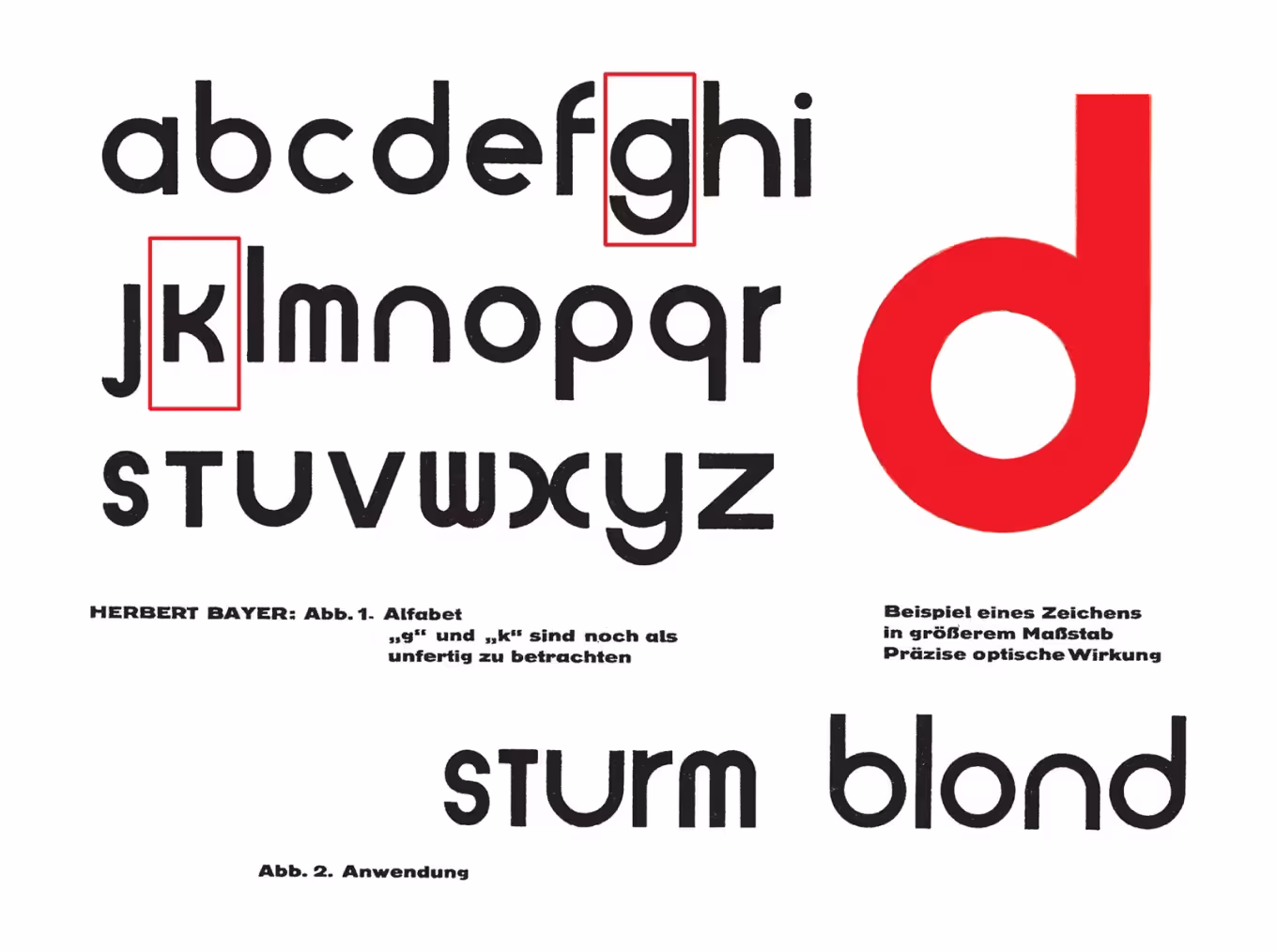 Самый известный шрифт, связанный со стилем Баухаус — это Sturm Blond, разработанный Гербертом Байером в 1925 году. Он был создан простым и удобочитаемым по сравнению с предыдущими шрифтами. Сегодня этот шрифт называется просто Bauhaus.