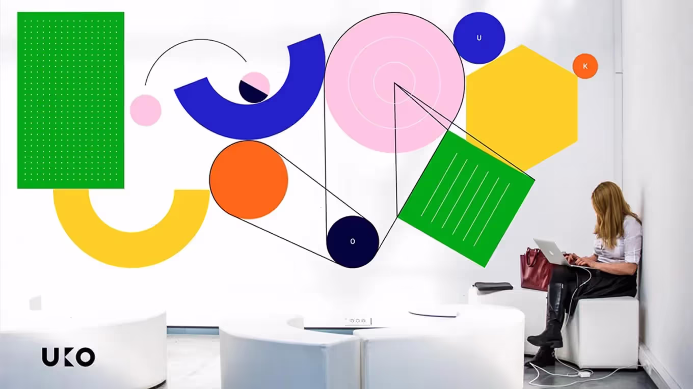 Например, при создании бренда онлайн-платформы UKO, которая предназначена для совместной работы команд и упрощения рабочих процессов, использовались уникальные элементы стиля Баухаус. Простые формы, тонкие линии и другие геометрические элементы создают красочный и привлекательный эффект. Брендинг UKO включает как статичные изображения, так и анимированные иллюстрации, которые подчеркивают фокус продукта на организации, взаимодействии и решении проблем.