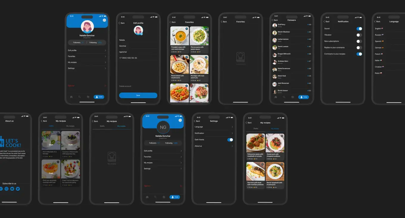 Сервис с коллекцией рецептов Let’s cook предлагает текстовый и мультимедийный контент в темном режиме. В приложении представлены кухни разных стран. Также пользователи могут ознакомиться с рецептами известных шеф-поваров. К каждому рецепту прилагаются пошаговые инструкции с фотографиями, списком ингредиентов, описаниями и видео приготовления. Цвет фона — темно-серый, а в качестве акцента выбраны оттенки синего.