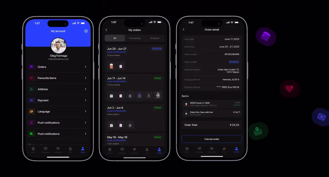 Приложение Pharmacy предназначено для подбора пищевых добавок с учетом индивидуальных особенностей пользователей для немецкого рынка. Темный цвет основного пространства и яркие акцентные цвета подчеркивают многообразие и широкий ассортимент сегмента.