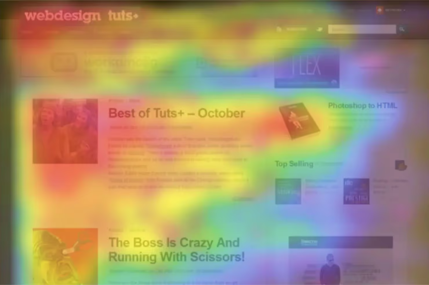 Согласно исследованию специалистов Института Пойнтера, в первые доли секунды пребывания на сайте взгляд человека падает на области, которые обозначены красным цветом на картинке ниже: