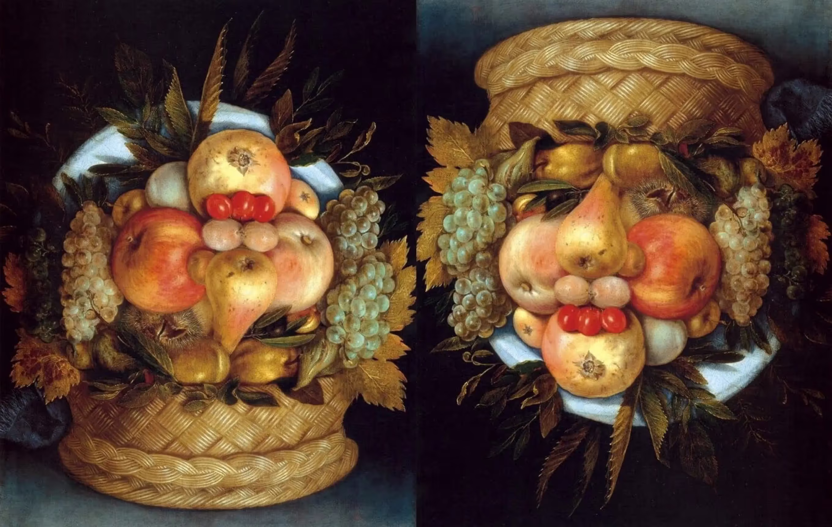 Серия портретов из фруктов и овощей Джузеппе Арчимбольдо — это известный пример каламбуров в искусстве. Художник создавал портреты-«перевертыши», используя фрукты, овощи, цветы и другие предметы. Каламбур заключается в том, что это одновременно и натюрморт, и портрет.