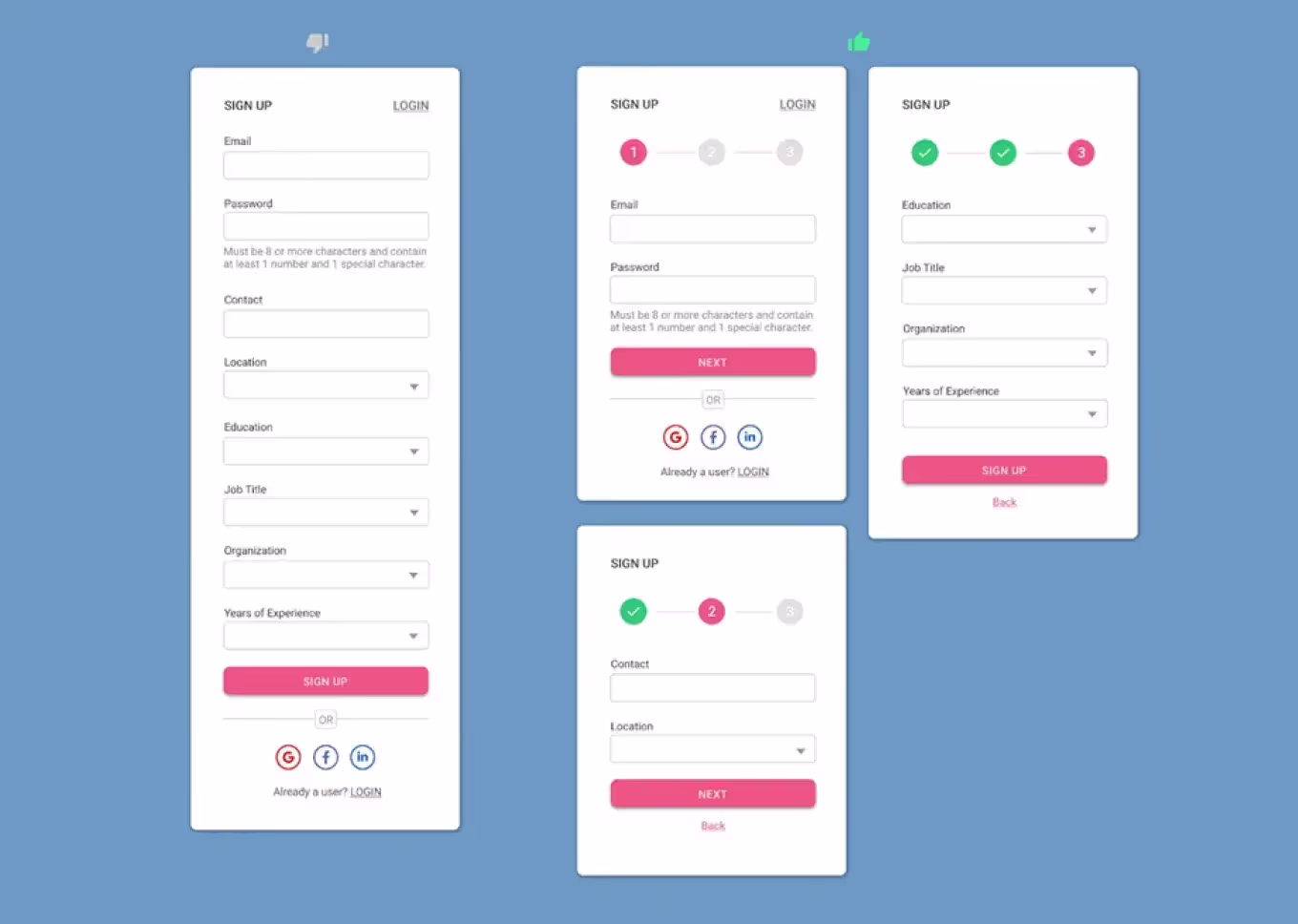 Закон Миллера полезен при создании различных форм. Не стоит пугать пользователей большим количеством полей. Сгруппируйте их по смыслу и разделите на шаги, чтобы заполнять их постепенно. На каждом шаге предлагайте пользователю от 5 до 7 полей. Так вы снизите когнитивную нагрузку и уменьшите процент отказов.